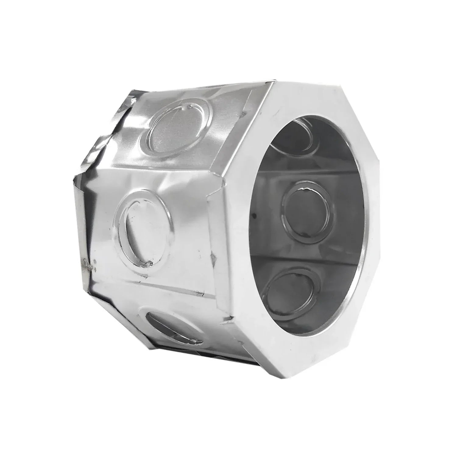 Bote integral octagonal, perfecto para instalaciones eléctricas seguras y duraderas. Facilita la conexión de cables gracias a sus orificios y protege contra la corrosión, ideal para techos y paredes en obra