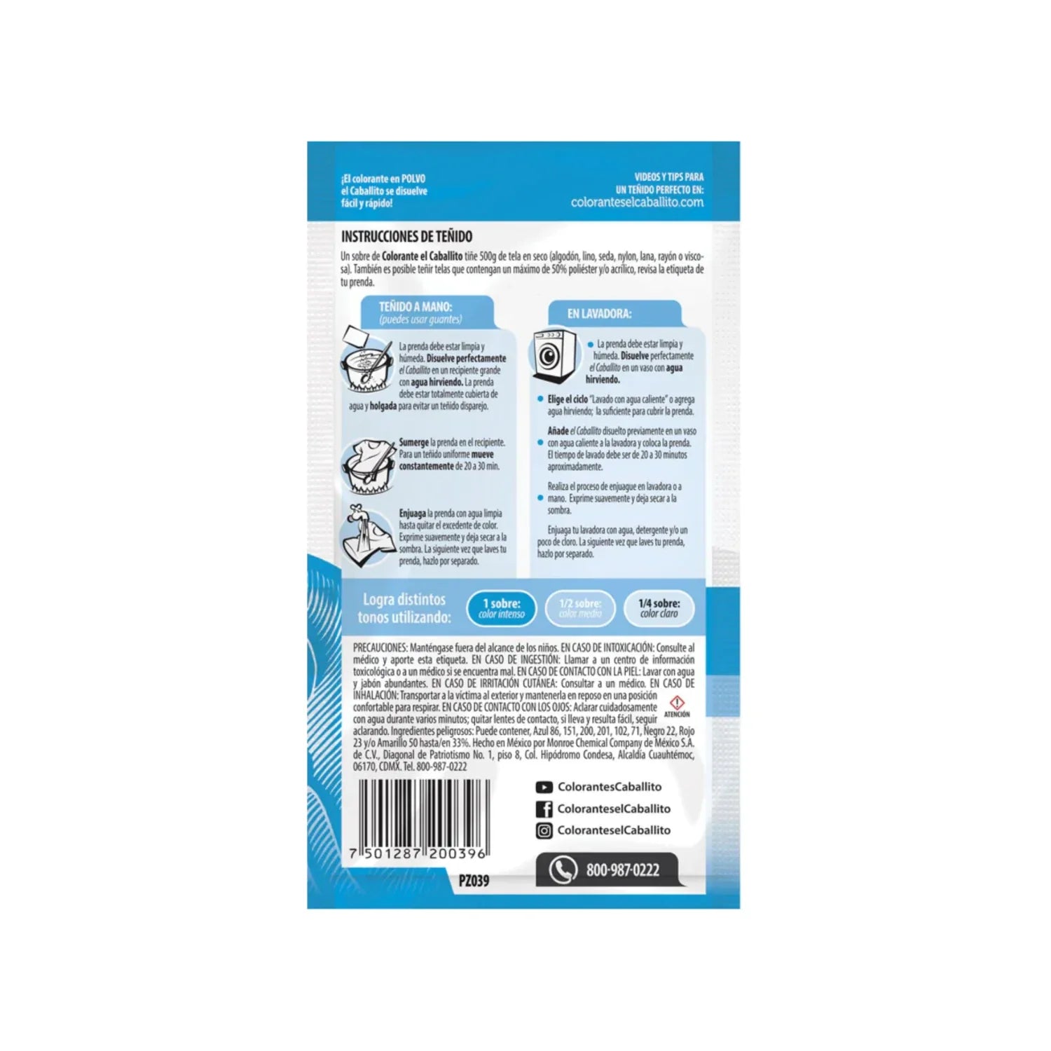 Colorante en polvo Caballito, ideal para teñir y revivir prendas de algodón, lino, seda, nylon, lana, rayón o viscosa, así como telas con hasta 50 % de poliéster o acrílico. Su fórmula incluye fijador integrado, lo que garantiza una mayor durabilidad del color. Se disuelve rápidamente en agua caliente, facilitando el proceso de teñido tanto en lavadora como manualmente.
