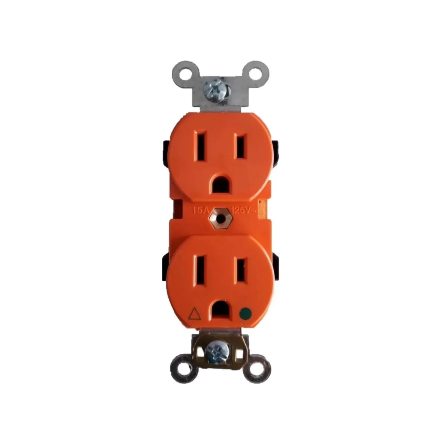 Contacto dúplex con conexión a tierra aislada. Diseñado para aplicaciones industriales, comerciales. Su color naranja lo identifica como componente de seguridad eléctrica. Fabricado en baquelita y latón