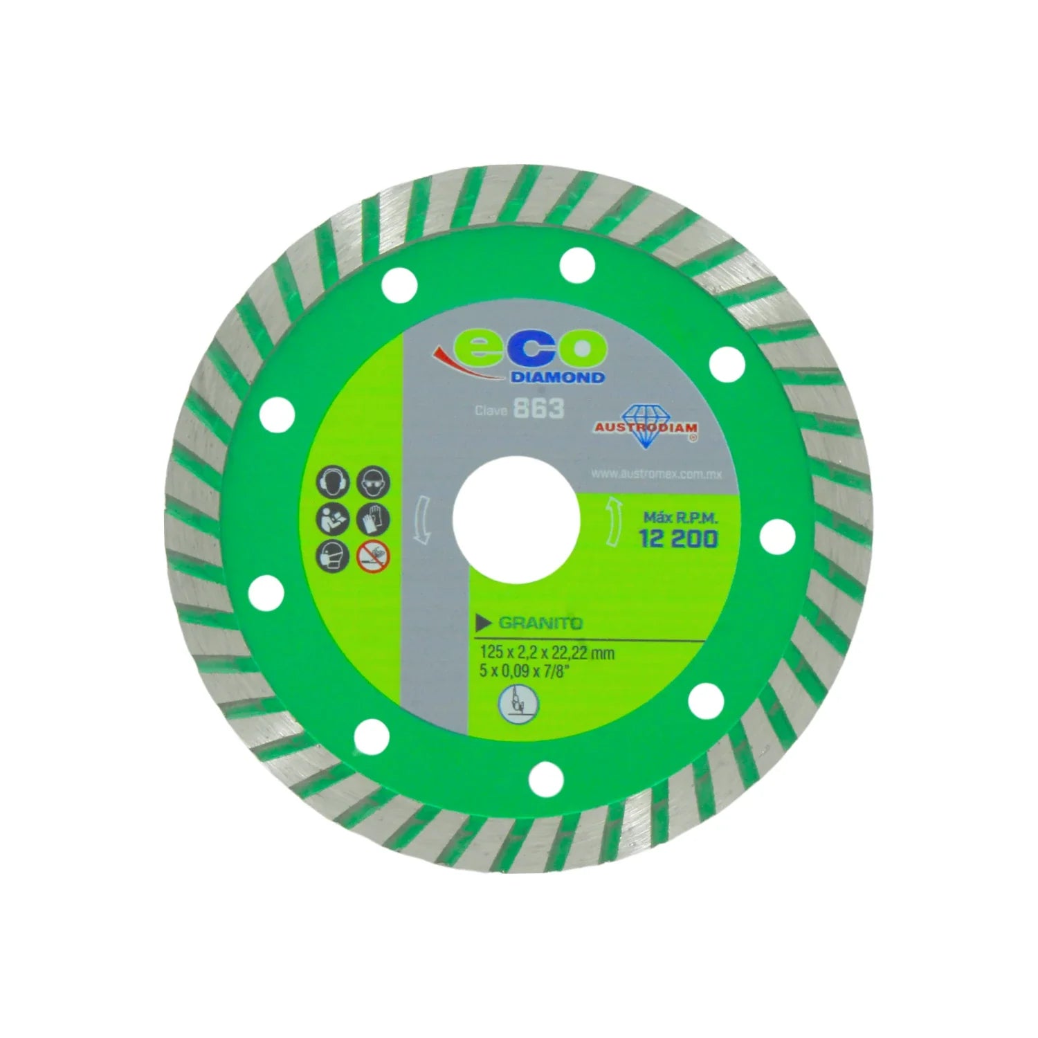 Disco diamantado Austromex 863 de 5" con corona continua, diseñado para corte húmedo en granito, mármol, cerámica y azulejo. Su grano ECO 30–60 y altura de segmento de 10 mm permiten cortes rápidos, precisos y con excelente acabado superficial. Incluye reductor a 20 mm para mayor compatibilidad con esmeriladoras angulares.