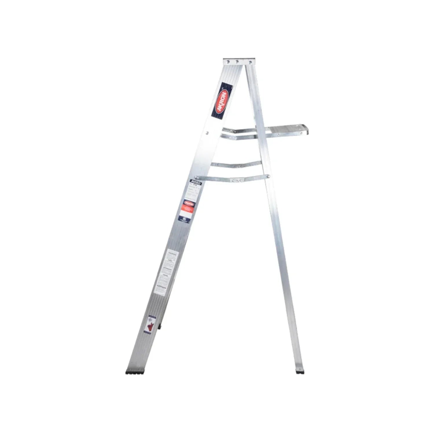 La escalera tipo tijera Akron modelo 77-14 está fabricada en aluminio tubular, diseñada para tareas domésticas y comerciales ligeras. Su estructura plegable incluye bandeja superior y porta cubeta de plástico, lo que la hace práctica y funcional para trabajos en altura. Los peldaños planos estriados y los tacones plásticos antiderrapantes brindan seguridad y estabilidad en superficies lisas.