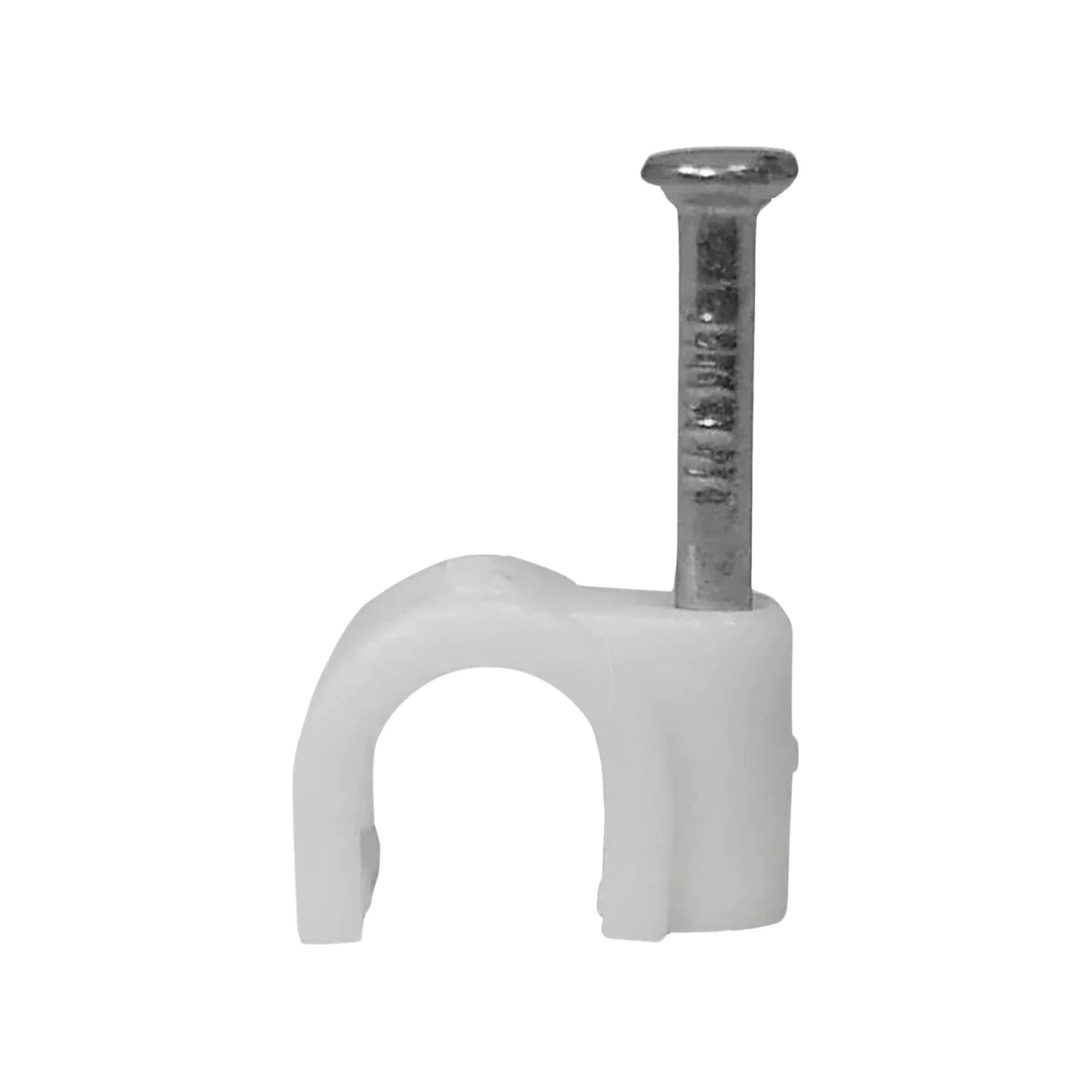 Grapa curva de 6 mm marca Argos modelo GC006MM fabricada en polipropileno blanco con clavo de acero para concreto. Diseñada para fijar cables redondos como coaxiales o telefónicos en muros lisos, ofreciendo resistencia a impactos, flexión y rayos UV.