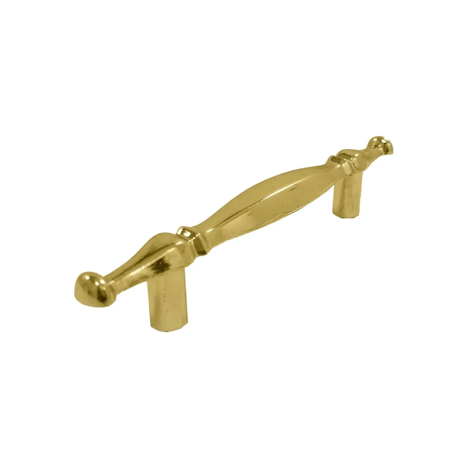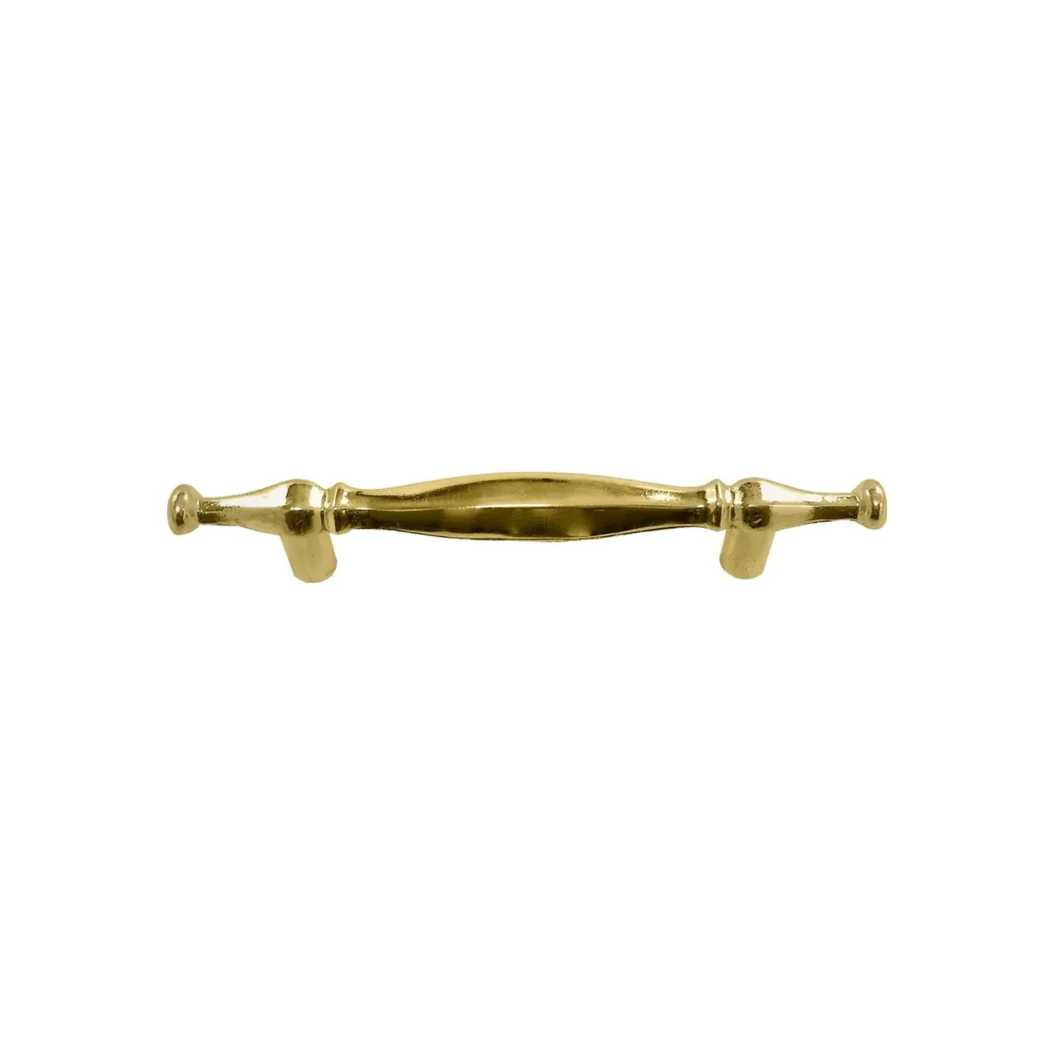 Jaladera decorativa Rish modelo Egipcia 76 mm, fabricada en latón brillante. Diseño clásico tipo puente con detalles ornamentales inspirados en el arte egipcio. Ideal para muebles de estilo tradicional, vintage o colonial.