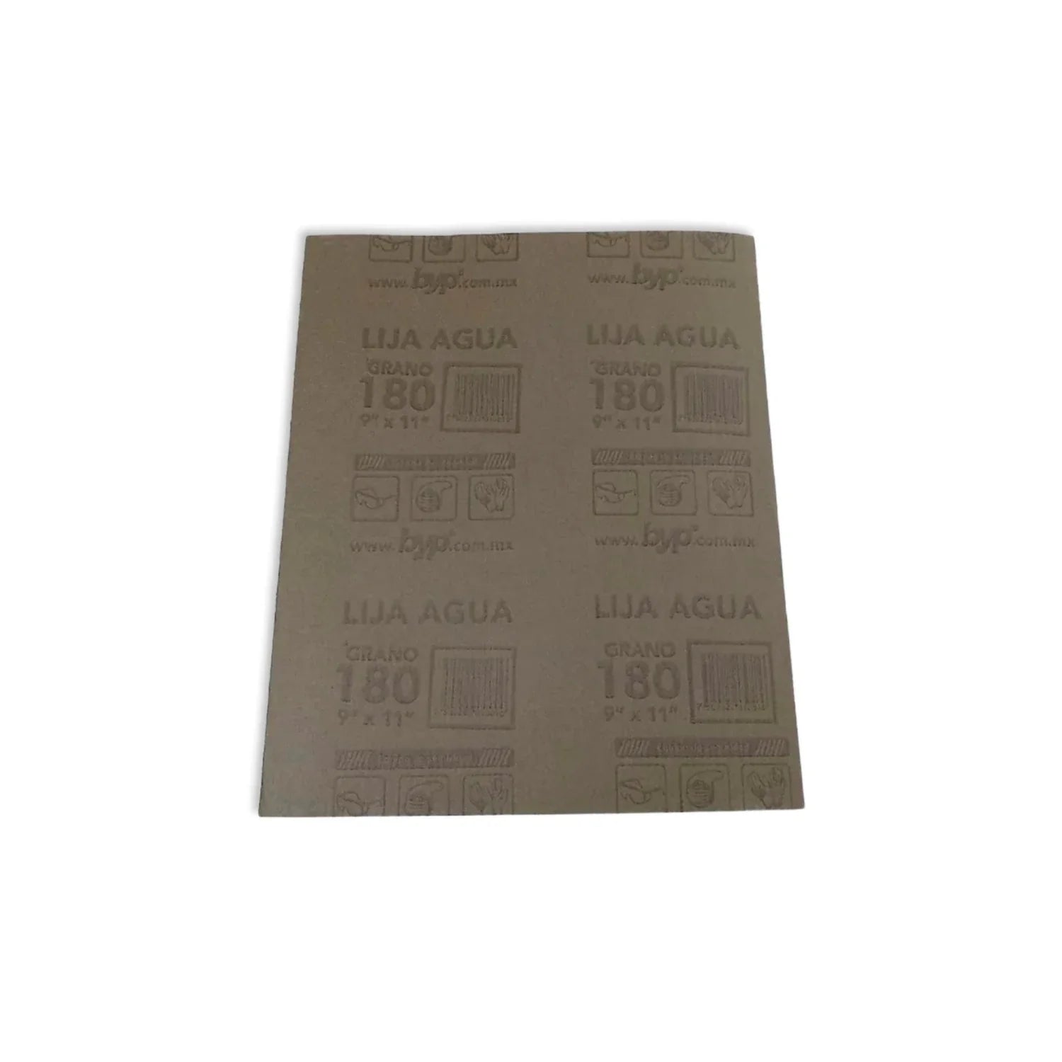 Lija de agua Byp modelo LAG18 grano 180 fabricada con carburo de silicio sobre papel impermeable tipo látex francés. Grano fino ideal para lijado de precisión en superficies como plástico, vidrio, pinturas, lacas y metales ferrosos y no ferrosos.