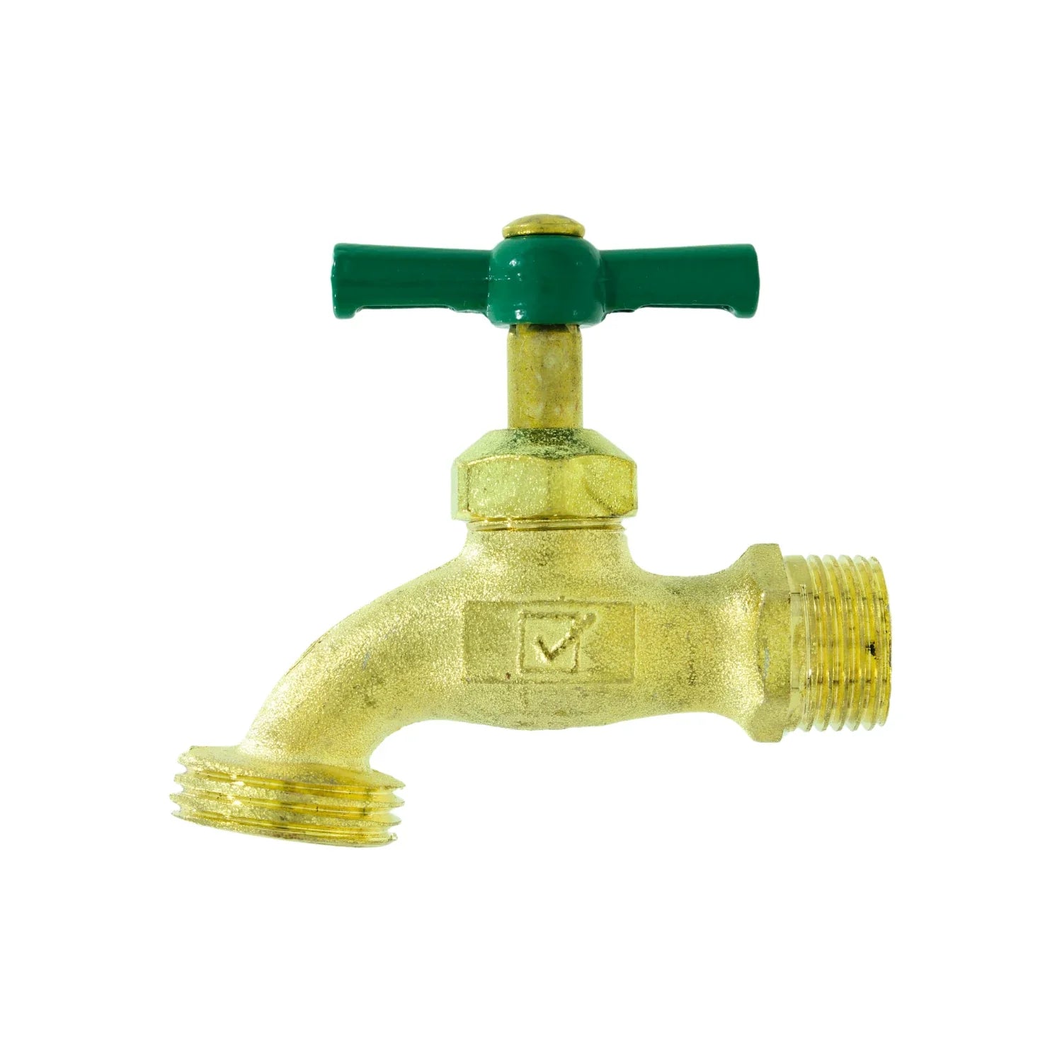 Llave metálica para jardín con cuerpo de zinc moldeado y acabado brillante. Su diseño permite una conexión directa a mangueras sin adaptadores, ideal para instalaciones exteriores en zonas de riego continuo.