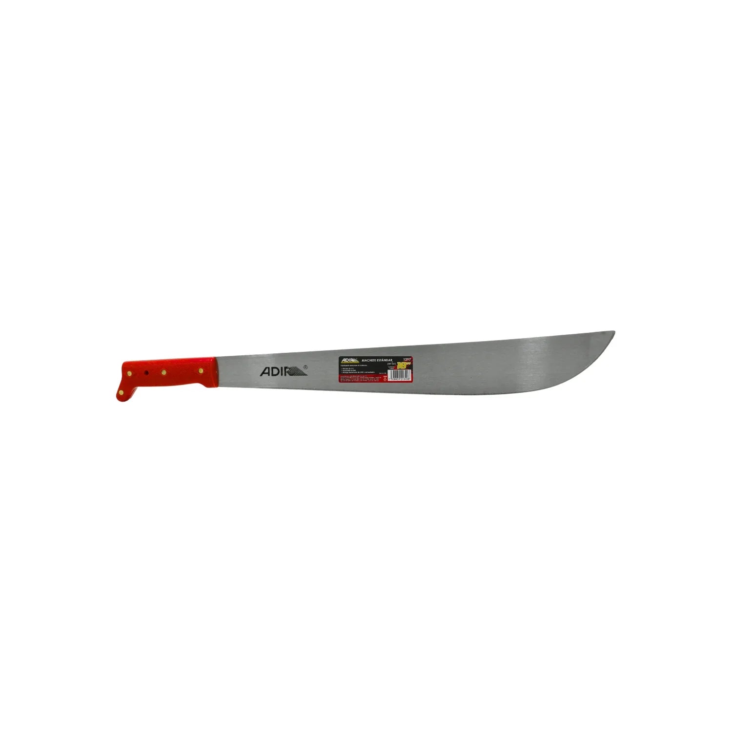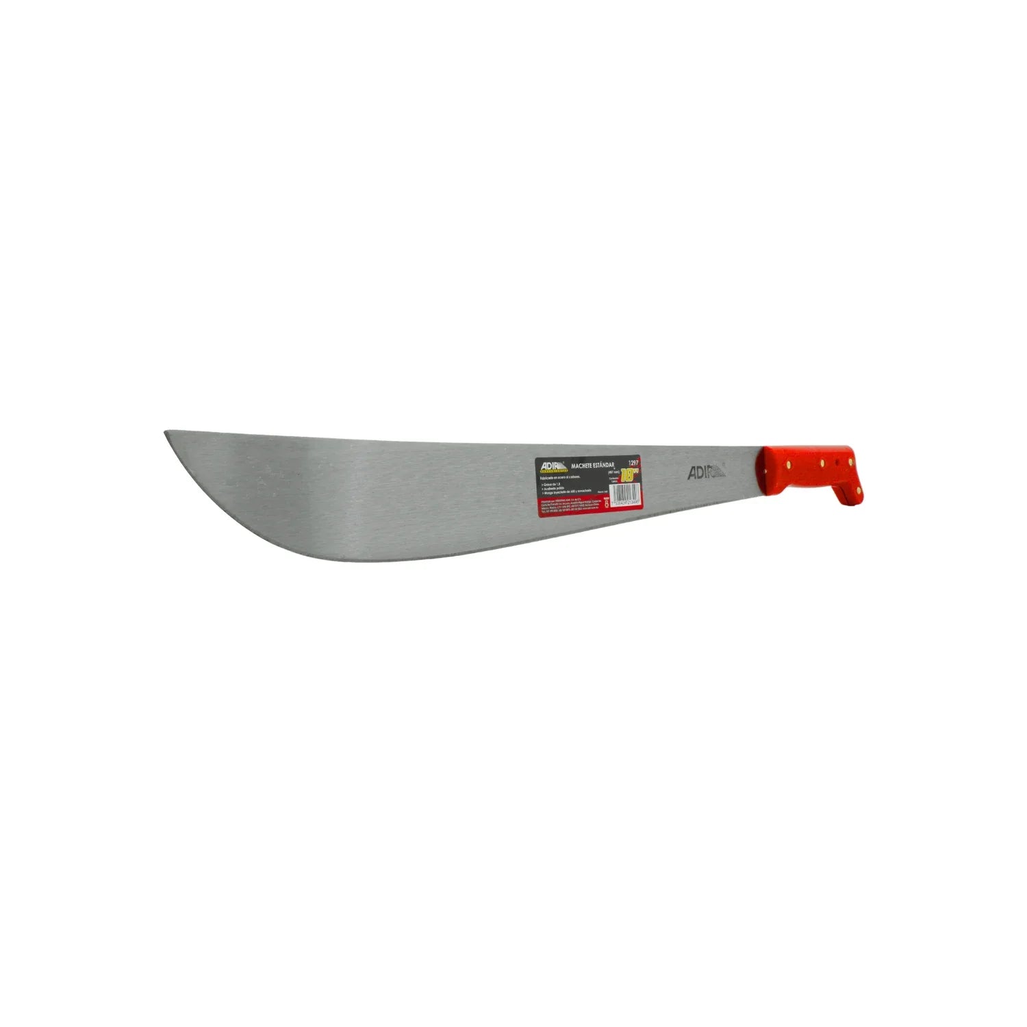 Machete Adir 1297 de 18 pulgadas, hoja recta pulida de acero al carbono. Ideal para corte de maleza, ramas y uso agrícola general. Mango plástico. Diseño económico y funcional para tareas ligeras.