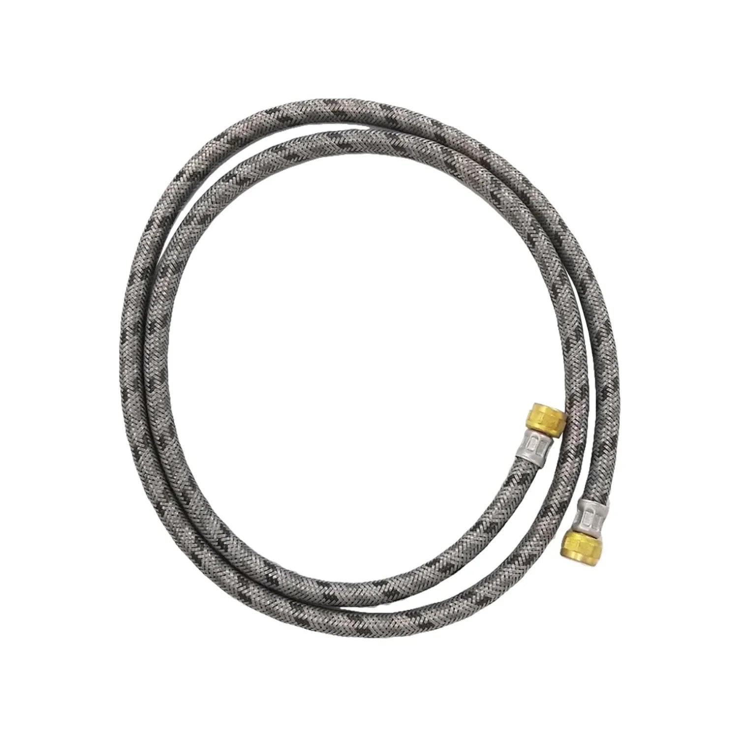 Manguera metálica de 1.5 m con recubrimiento trenzado y conexiones niqueladas diseñada para instalaciones domésticas de gas LP en estufas y calentadores con alta resistencia térmica y ajuste seguro