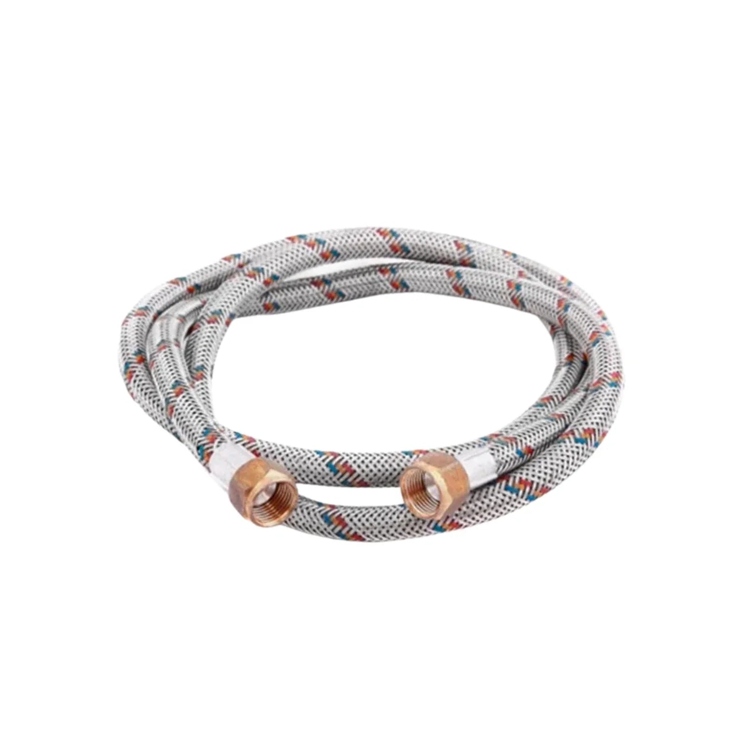 Manguera metálica de 1.5 m con recubrimiento trenzado y conexiones niqueladas diseñada para instalaciones domésticas de gas LP en estufas y calentadores con alta resistencia térmica y ajuste seguro