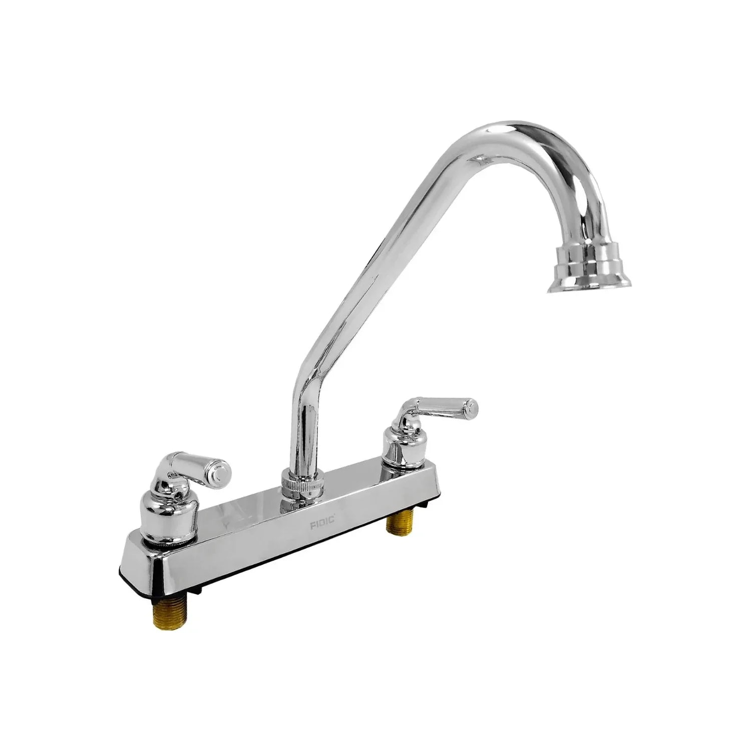 Mezcladora Fidic F8205 para fregadero de 8", fabricada en bronce con cuello y cubierta metálicos. Acabado cromado brillante, sistema de doble maneral metálico de 1/4 de vuelta y aireador ajustable. Diseñada para cocinas residenciales que requieren alta durabilidad, control preciso y resistencia a la corrosión.