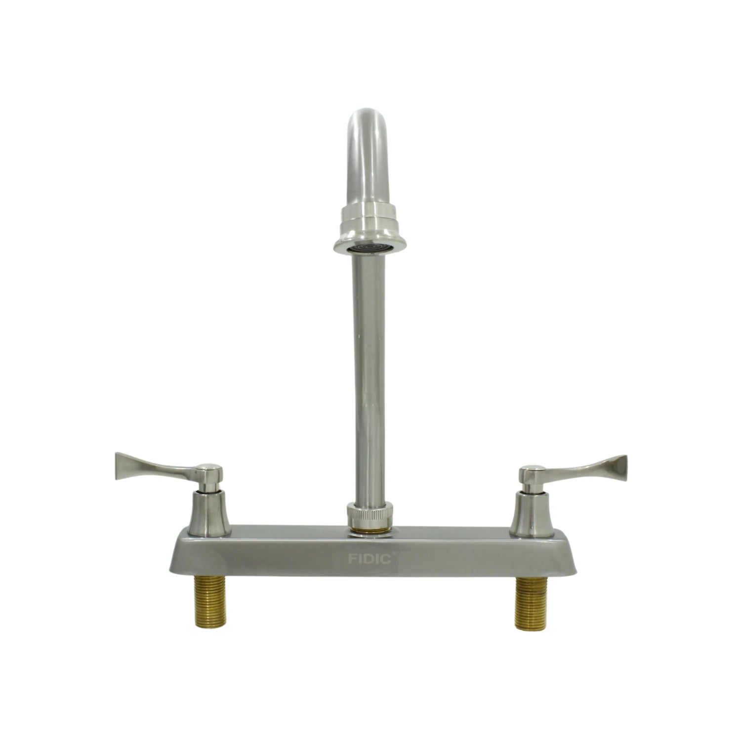 Mezcladora Fidic F8211BN para fregadero de 8", fabricada en bronce con cuello y cubierta metálicos. Acabado cromado brillante, sistema de doble maneral metálico de 1/4 de vuelta y aireador ajustable. Diseñada para cocinas residenciales que requieren alta durabilidad, control preciso y resistencia a la corrosión.