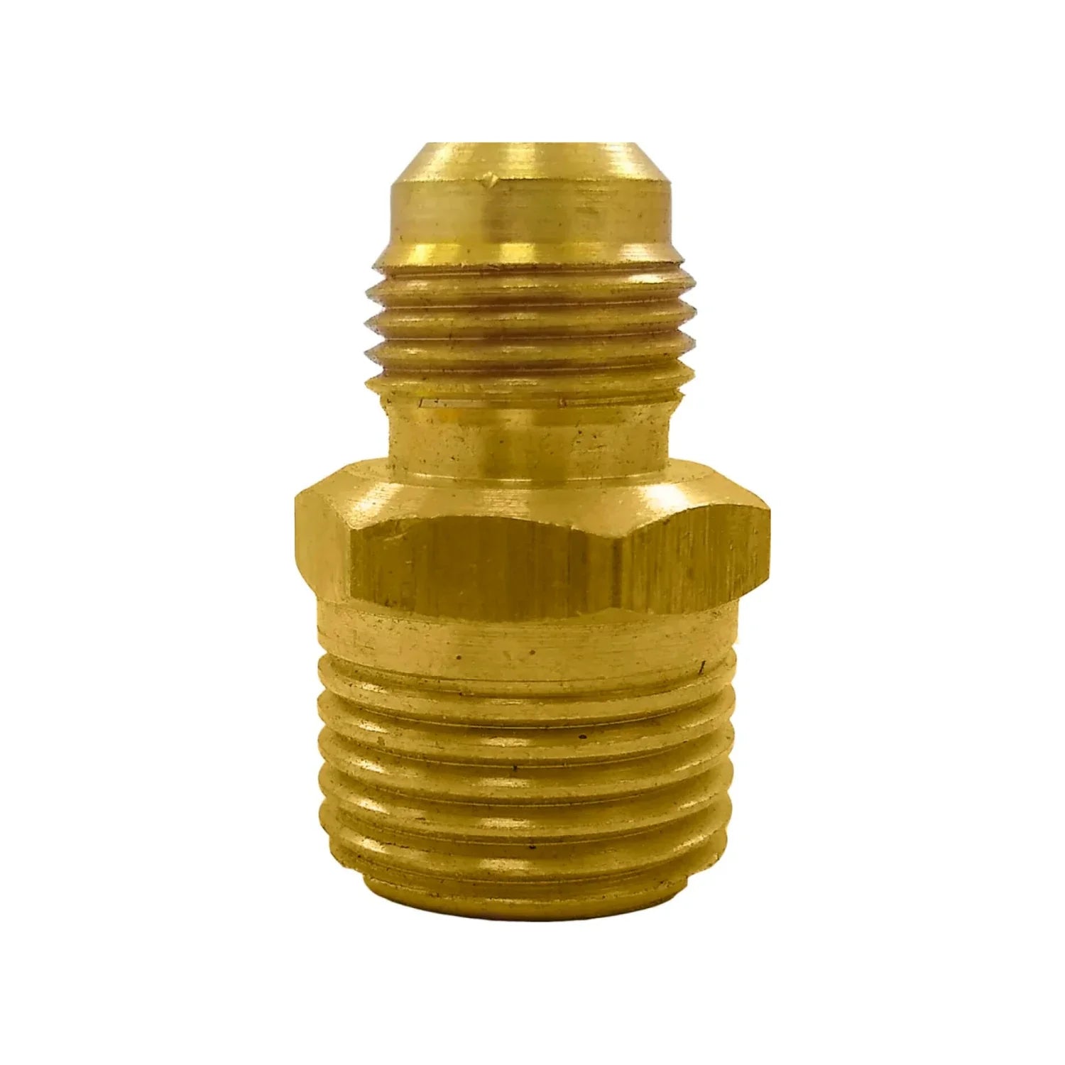 Niple terminal latonado Aleamex AG-NT1013 3/8" x 1/2" para unir rosca NPT a manguera o flare. Ideal para instalaciones de gas LP o natural.