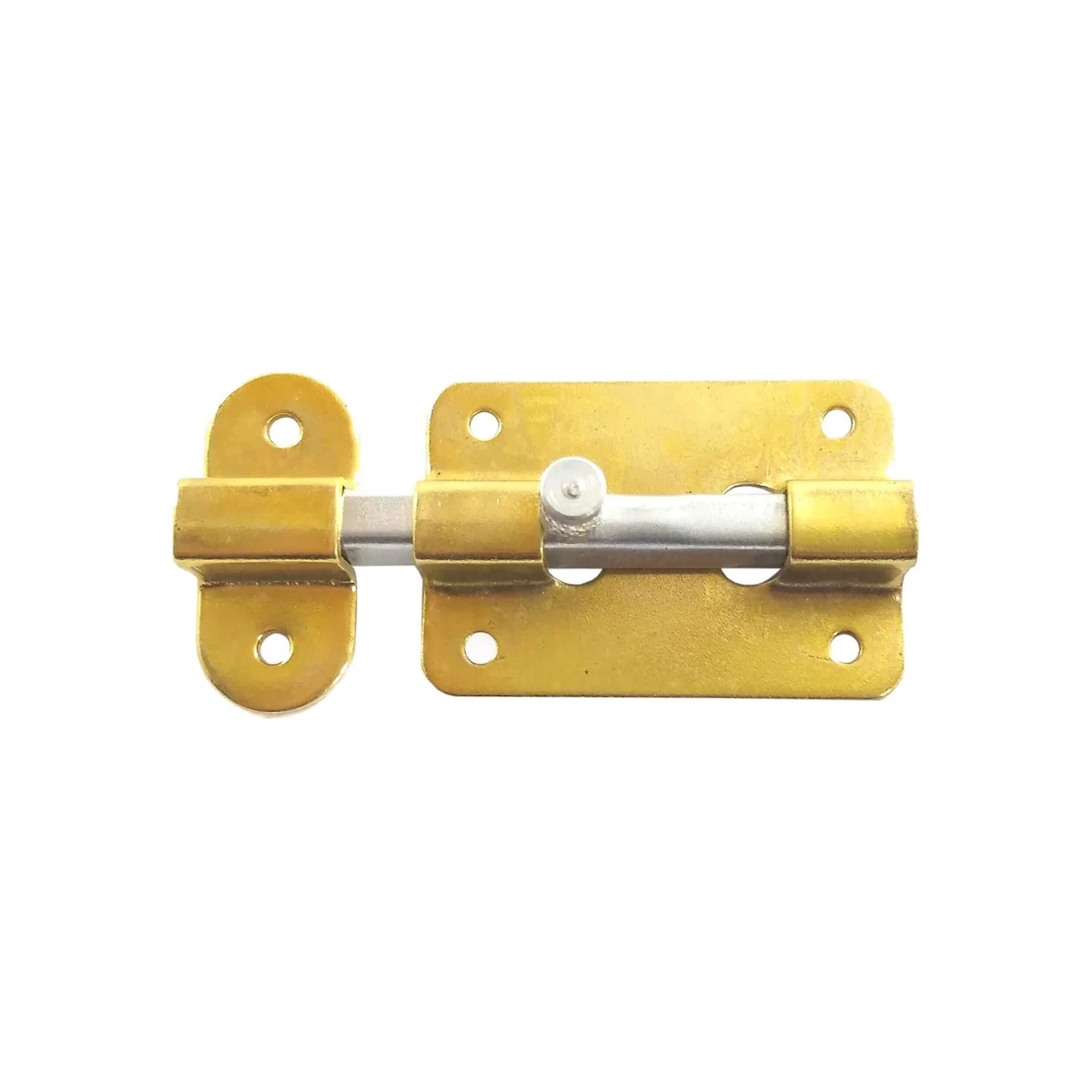 Pasador dorado liso de 5 cm fabricado en acero con acabado brillante, diseñado para sobreponer en puertas interiores, muebles o portones ligeros que requieren cierre decorativo y funcional en espacios reducidos