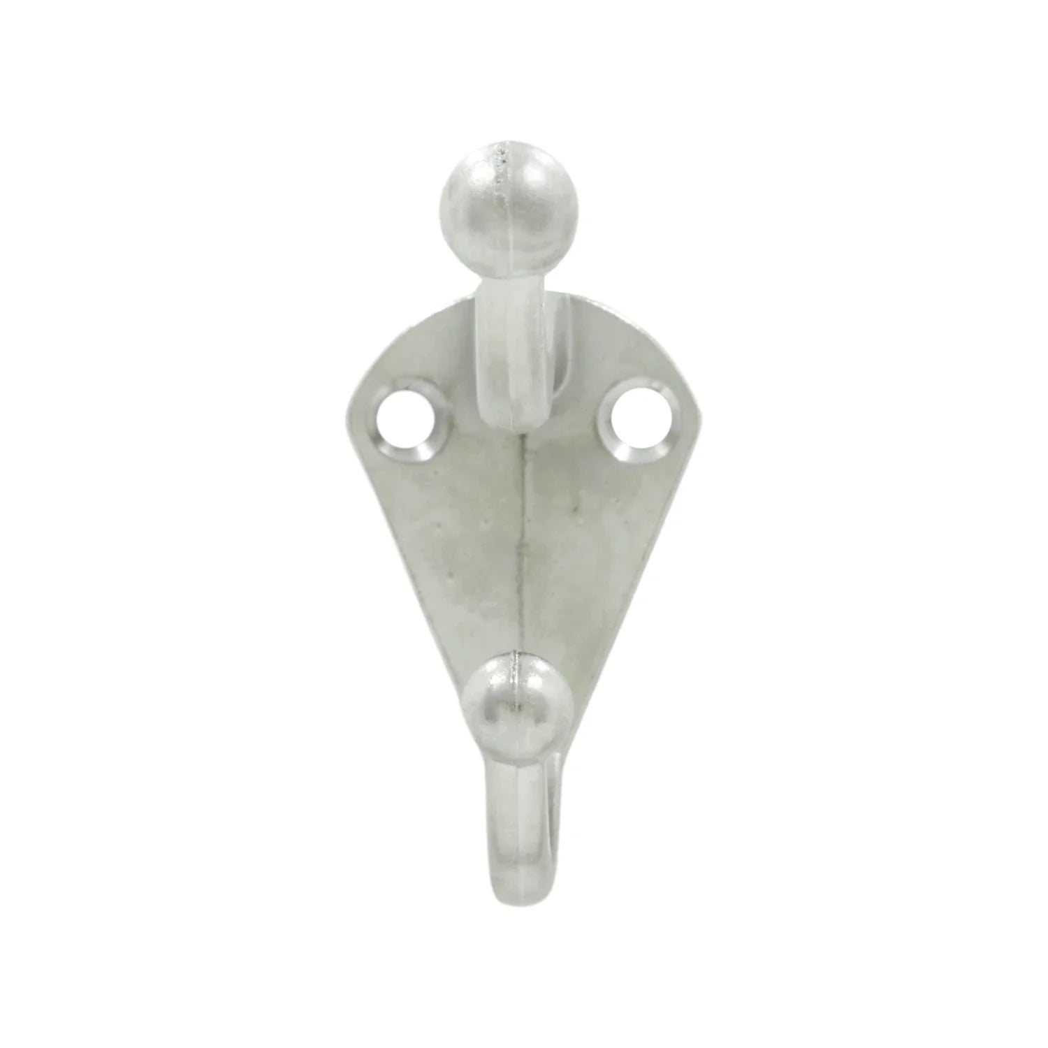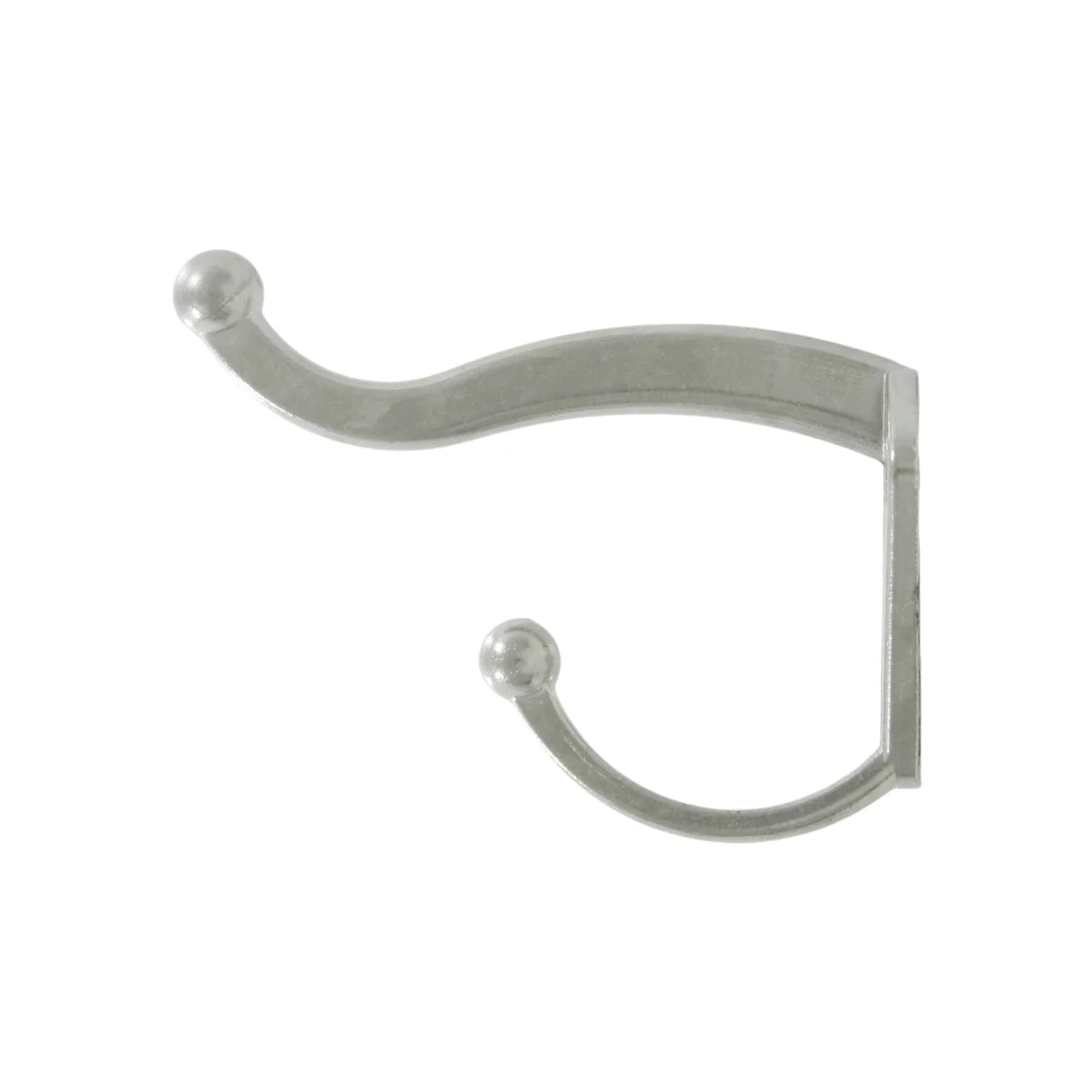 Gancho doble tipo sombrero Handy Home 1836 en acabado níquel satinado, fabricado en zamak de alta resistencia. Su diseño funcional incluye un gancho superior para sombreros y uno inferior para abrigos o accesorios, permitiendo organización eficiente sin dañar las prendas. Ideal para entradas, clósets, oficinas o comercios que requieren estética y durabilidad.