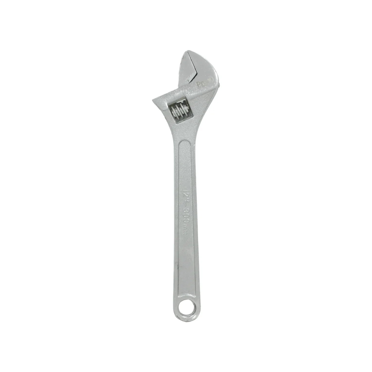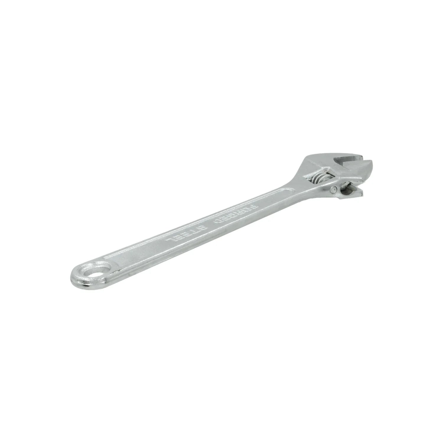 Llave ajustable tipo perico Prax 181194 de 12 pulgadas, fabricada en acero forjado con tratamiento térmico para mayor durabilidad. Su mordaza fija con escala milimétrica permite ajustes precisos en trabajos mecánicos, hidráulicos y de mantenimiento general.