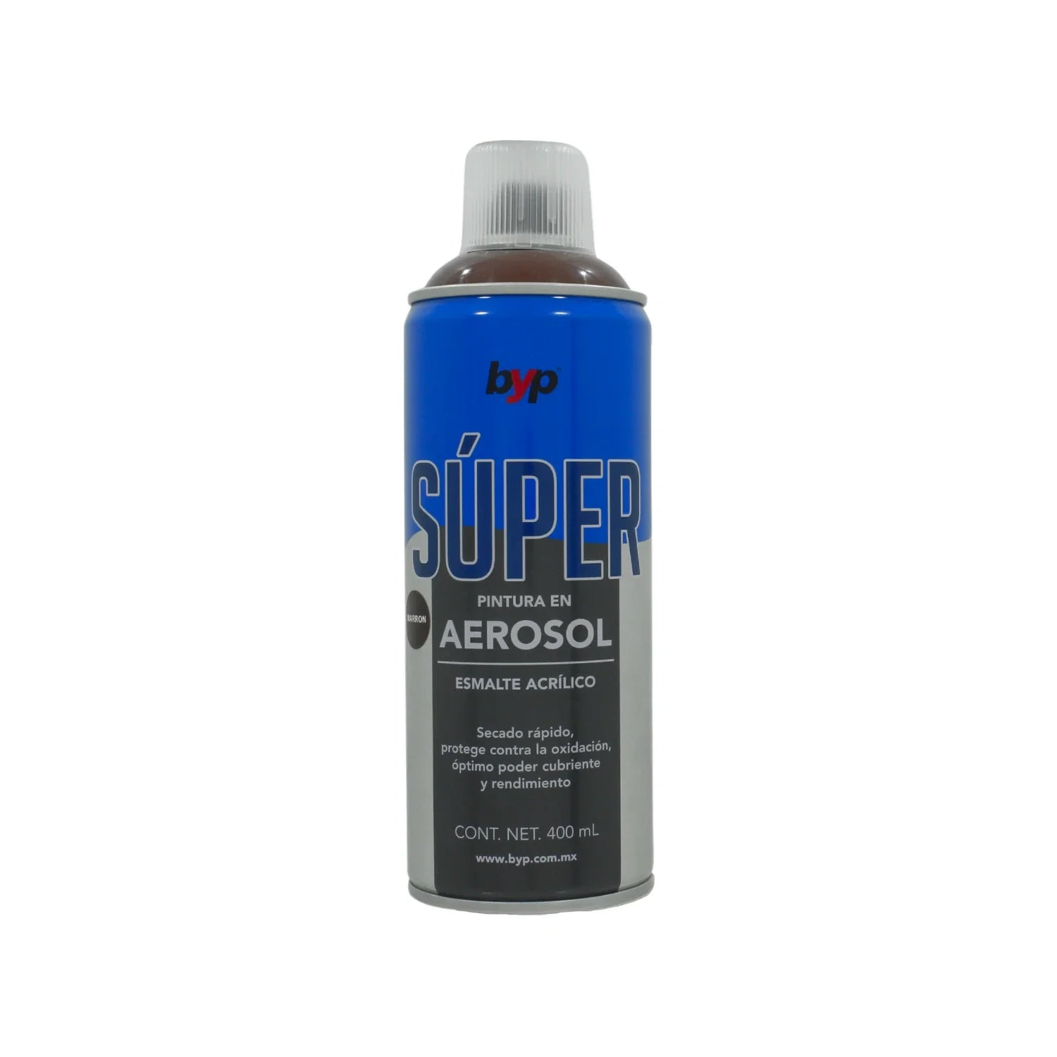 Pintura en aerosol acrílica Byp Súper AMAS00 color marrón, presentación de 400 ml. Ideal para decoración, artesanías, ventanería, electrodomésticos, vehículos, metal, plástico y madera. Excelente poder cubriente, secado rápido, acabado mate uniforme. Uso interior y exterior. Libre de CFC.