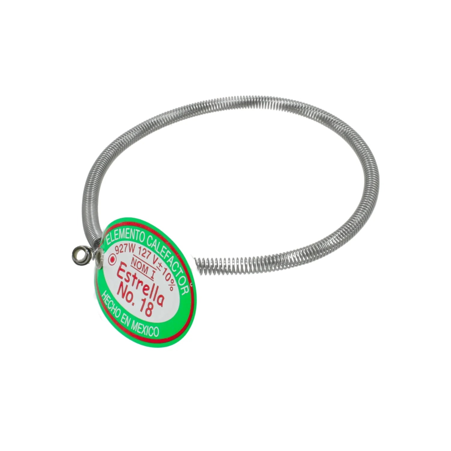 Resistencia #18 Estrella, fabricada en acero de alta calidad, diseñada para aplicaciones que requieren altas temperaturas. Su potencia de 1200 W y voltaje de 127 V la hacen ideal para reemplazar resistencias en diversos artefactos eléctricos. Su calibre 18 permite una distribución eficiente del calor.